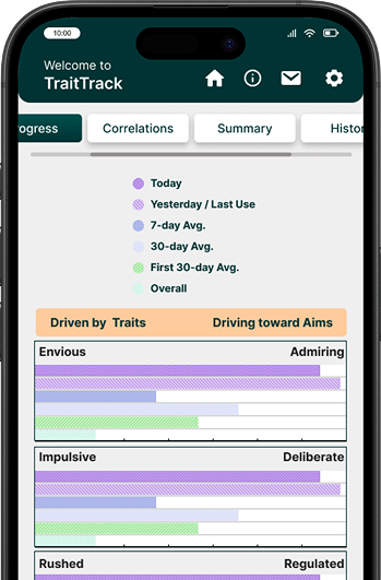 The primary aim of using TraitTrack is to become so self-aware that you have lots of opportunities to reassess and change your motives, patterns of thinking, and behaviors. Along the way, you’ll discover how to be an impartial observer of yourself, how your habits are reinforced by your traits, and how your traits reinforce one another.